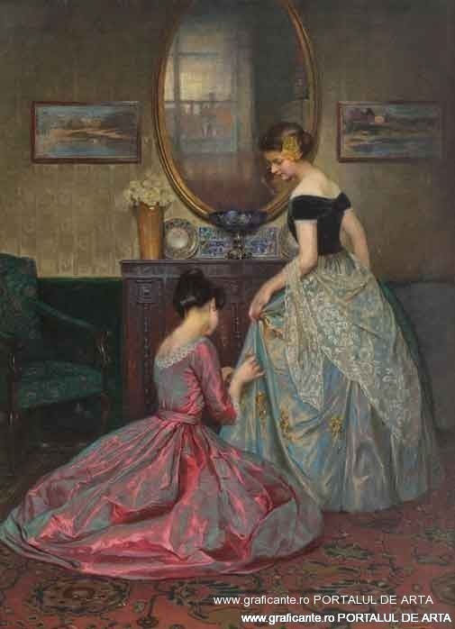 32 din cele 49 de loturi care sunt opere de arta in licitatia Art Nouveau, Romantism si Biedermeier de la Artmark de pe 11 aprilie 2012 reprezinta femei singure si/sau indragostite. Piesa centrala a licitatiei este un nud de Stefan Luchian, „Dupa baie”, evaluat intre 100 si 200.000 de euro. O lucrare interesanta este pictura „Pregatiri de bal” (foto) a lui Victor Schramm, evaluata la 3-6000 de euro si care este prezenta pe coperta catalogului licitatiei. Atorul, coleg de generatie cu Strambu si Vermont, nascut la Orsova, a parasit timpuriu tara si pictura sa este prea putin legata de stilul scolii romanesti. Nascut in 1865 si decedat in 1929, pictorul de origine germana (si scoala germana) se afla la debut in licitatiile de la Bucuresti. El apare rar si in licitatiile europene, cea mai recent vanduta pictura a sa fiind „Orientalischer Bazaar”, 5.500 de euro la Koln in 2006.